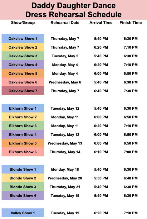 DRESS REHEARSAL: NEW this year, Dress Rehearsals for our Daddy Daughter Dance will take place during the week of your dancer’s class Dress Rehearsal(s)! Please note these weeks as scheduled below: