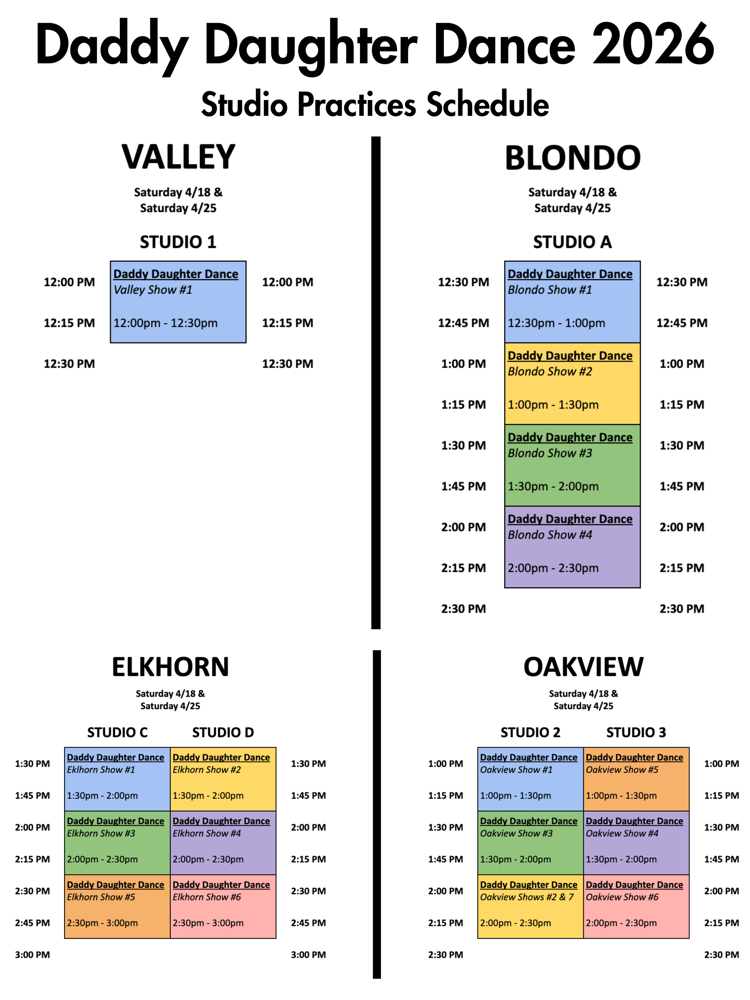 Specific Studio Practice times for each Show can be found on the colorgrid below—be sure you know the Show Number your Dad & dancer are performing in! (Please see the above registration info for details about finding your Show Number.)